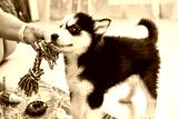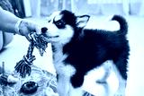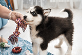 Siberian Husky puppy with blue eyes playing with a human indoor at home. Cute pet.