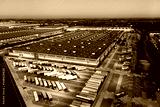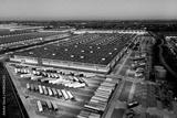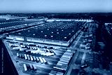 Top view of many trailers and containers near the logistics warehouse, in the evening
