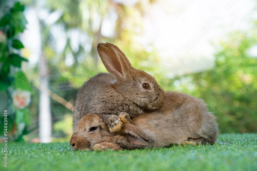 Little cute rabbit sitting on the grass. Bunny on green background.
