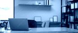 Minimalist bright desk in co-working office room with laptop and copy space on wooden table