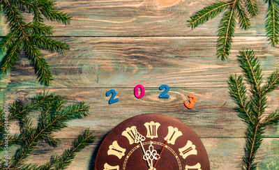 Christmas wooden background with clock and fir branches and a place to copy.