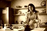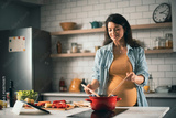Beautiful pregnant woman preparing delicious food. Smiling woman preparing delicious food.