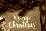 Christmas wooden background with fir branches and gifts with a place to copy.