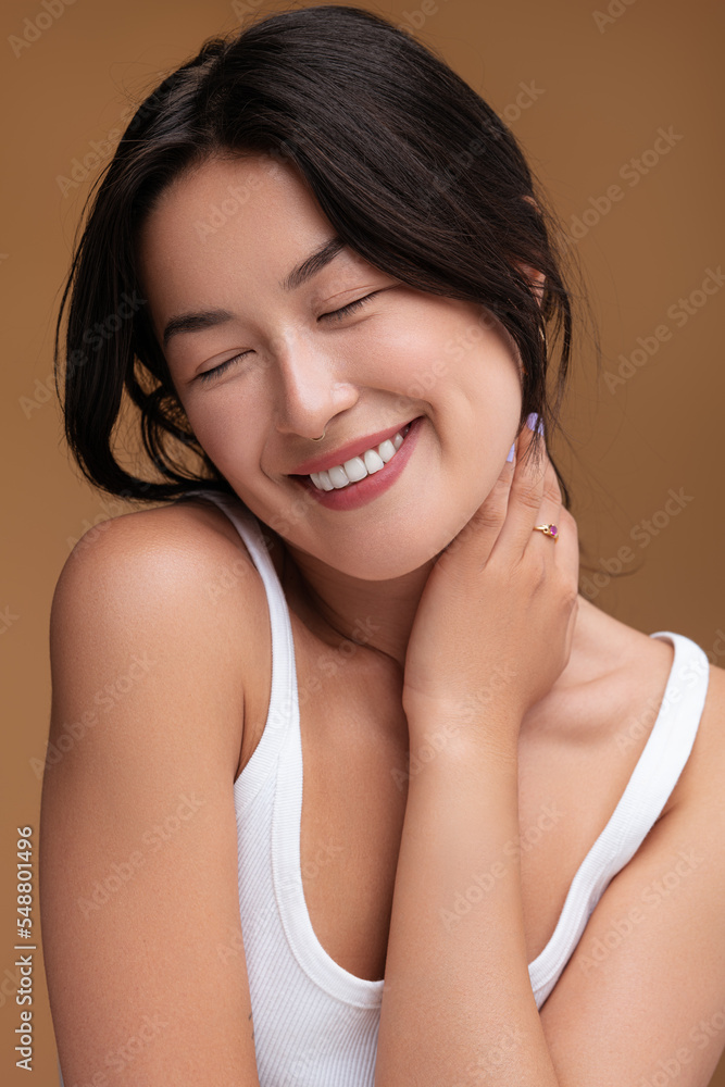 Grateful Asian woman touching neck
