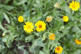 Yellow flowers of Common madia, marigold in the garden. Summer and spring time.