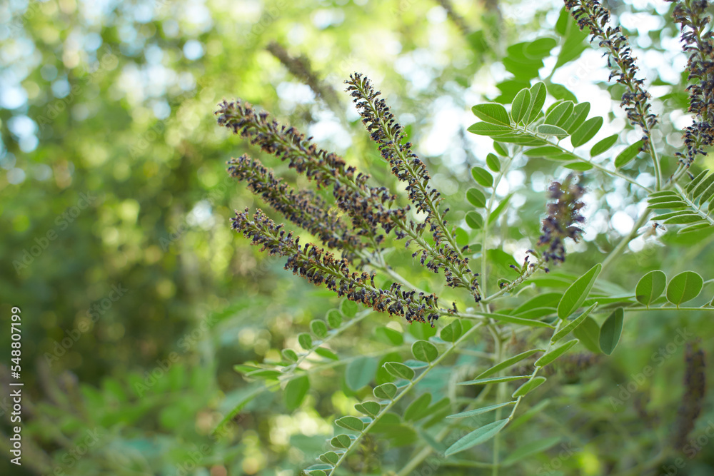 Purple flowers of False indigo bush (Amorpha fruticosa), Lead Plant in the garden. Summer and spring time.