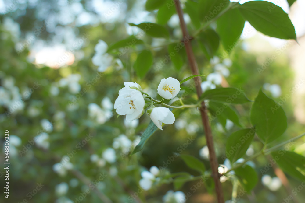 Philadelphus coronarius (sweet mock orange, English dogwood). White garden Jasmine flowers. Spring blossom background. Panorama, banner.