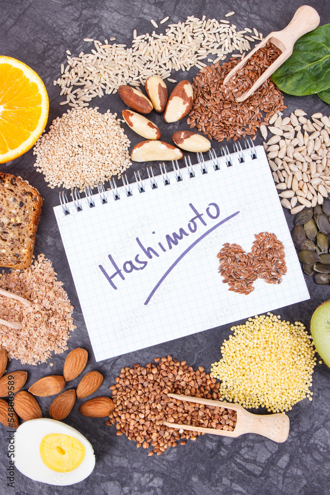 Notepad with inscription hashimoto and best ingredients or products for healthy thyroid. Food as source vitamins