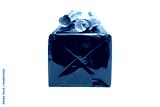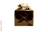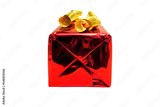 Beautiful red gift package wrapped in glossy paper and gold bow and cut out.