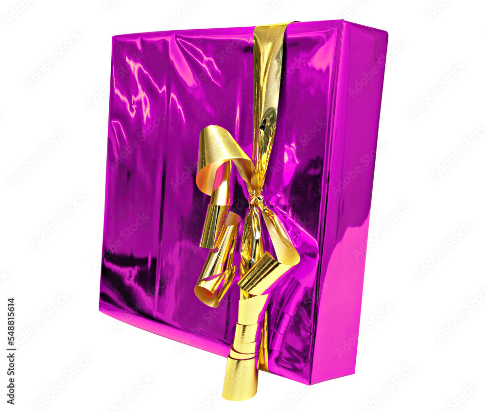 Beautiful purple gift package, wrapped in glossy paper and gold bow and cut free.