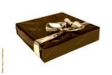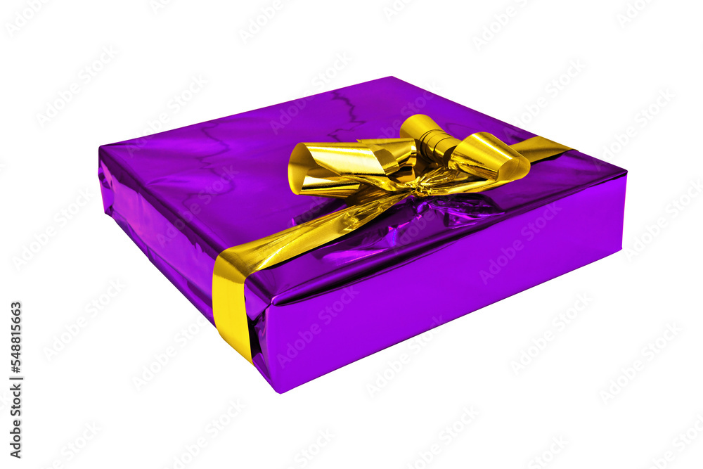 Beautiful purple gift package, wrapped in glossy paper and gold bow and cut free.