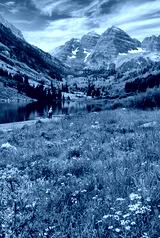 Hiker at Maroon Lake near Aspen, Colorado, with the Maroon Bells in the background