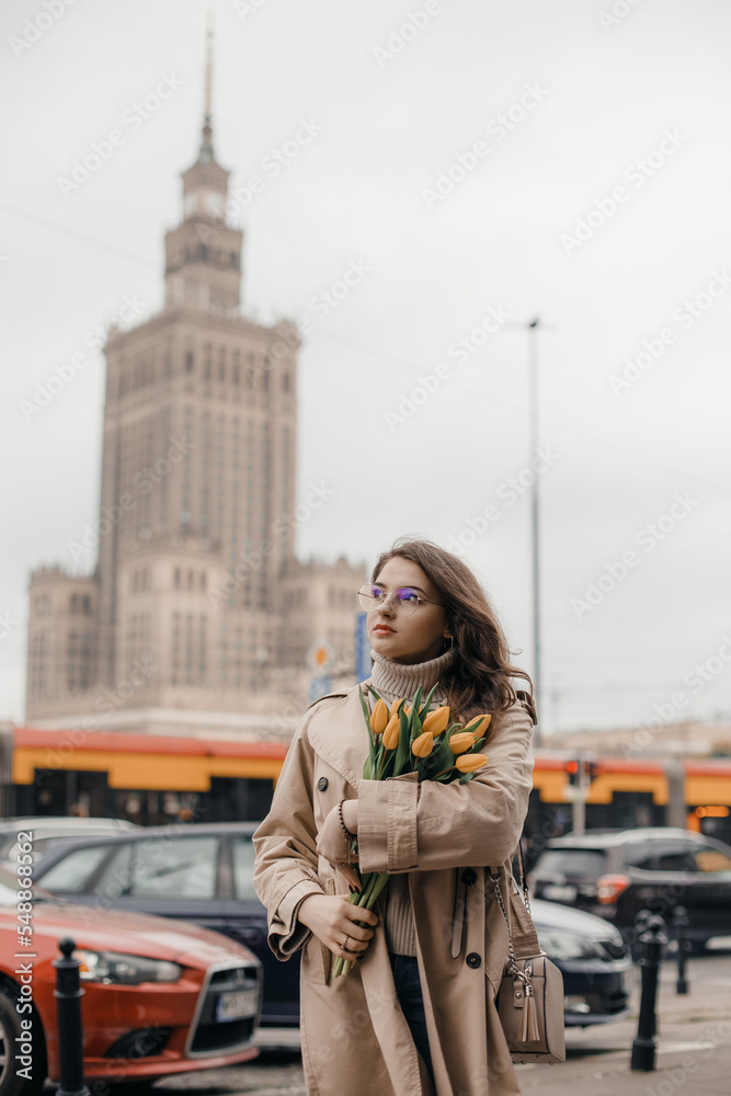 A young girl in glasses with flowers against the background of the Palace of Culture in Warsaw. A pretty girl in glasses with flowers walks in Warsaw.