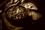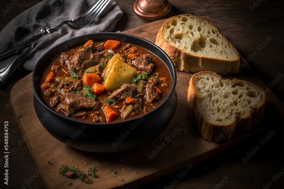 Hearty Beef Stew with potato in crock pot and a side of toast