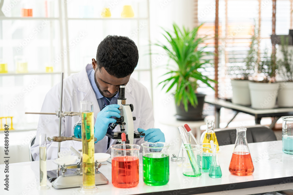 Male scientist working in medical biotechnology research laboratory using microscope for advanced chemistry analyzing. Man chemist working in the lab. Specialist looking through microscope.