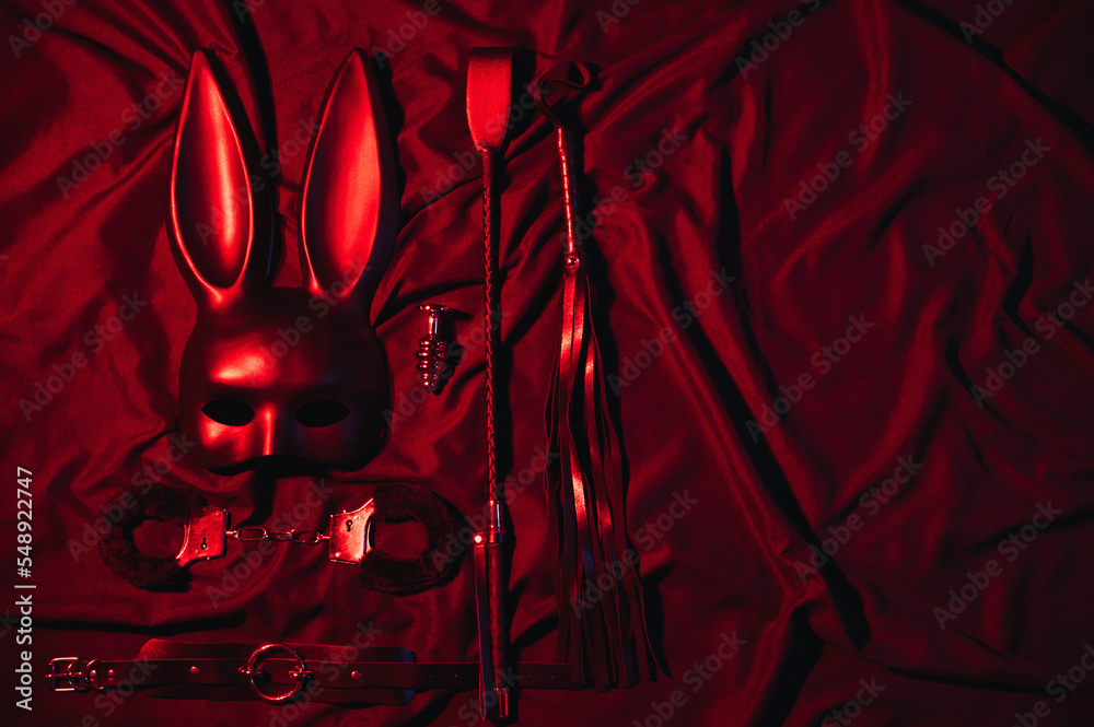 Set of erotic sex toys for adults. Handcuffs, leather whip flogger, mask, choker and butt plug for sex with domination and submission