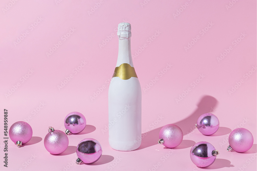 Christmas creative layout with pink Christmas baubles and champagne bottle on pastel pink background. Minimal New Year or Christmas celebration idea.