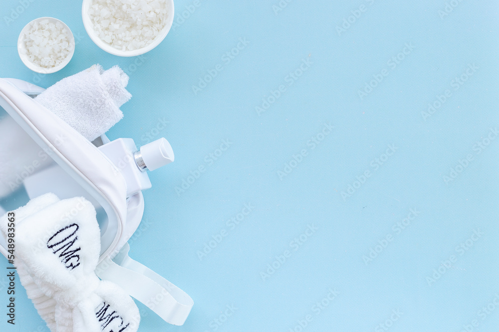 Cosmetic bag full of white cosmetic products and accessories, top view