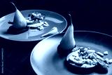 Two vegetarian dishes with pears on plates