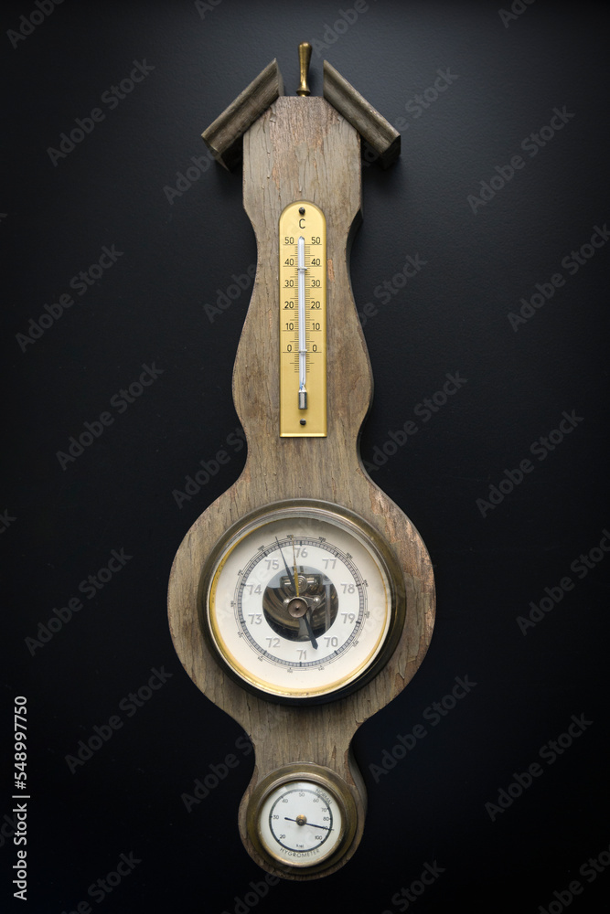 Old wall barometer with built-in hygrometer and thermometer. Black background