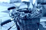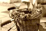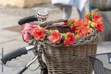 a wicker wooden basket for transporting flowers on a bicycle, selective focus, close-up.