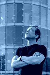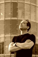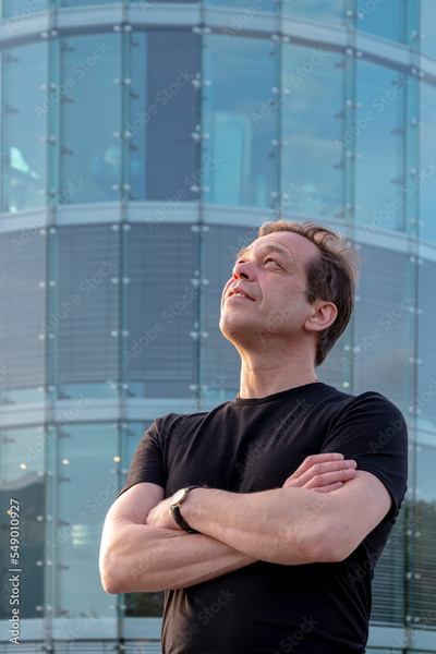 A street portrait of a 40-50-year-old man in a black T-shirt dreamily looks up against the blurred background of a glass building. Perhaps he is a tourist or a traveler, an actor or a pensioner.