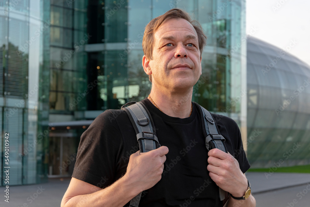 Male tourist 45-50 years old with a backpack on a modern glass building. Concept: tourism and travel, air travel and departure from the airport.