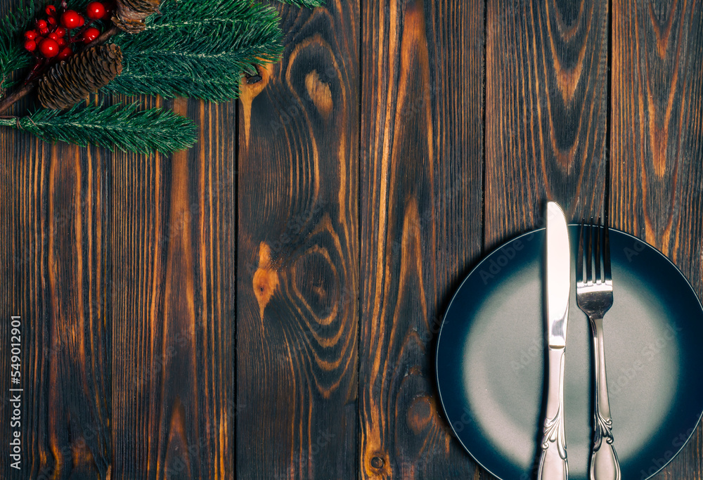 Christmas wooden background with fir branches and cutlery on a plate and a place to copy.