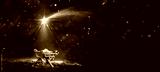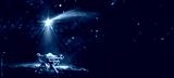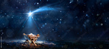 Nativity Scene - Birth Of Jesus Christ With Manger In Snowy Night And Starry Sky - Abstract Defocused Background
