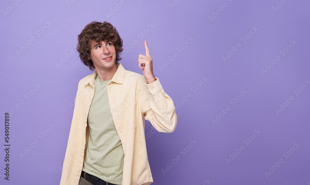 handsome man pointing up to copy space and smile face isolated on purple background. Teenager man looking at empty space for text advertisement.