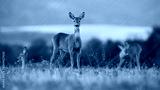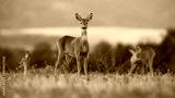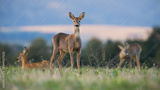 roe deer, capreolus capreolus, looking to the camera on meadow in autumn. Many hinds grazing on field in fall. Female mammal standing on pasture with others in background.