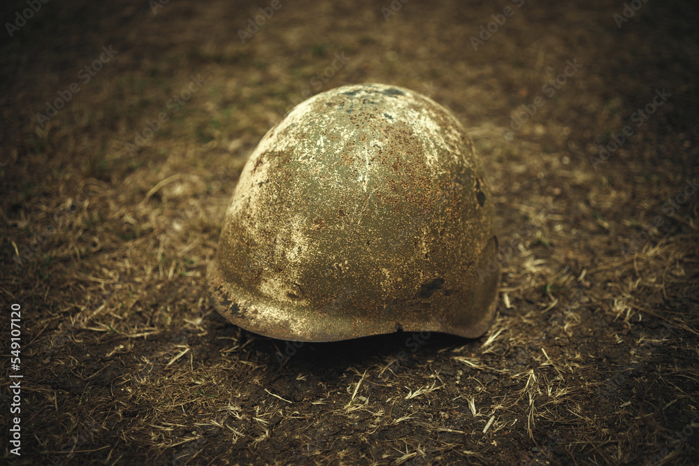 Metal helmet with traces of rust. An old helmet of a Soviet soldier lies on the ground. Artifacts of war.
