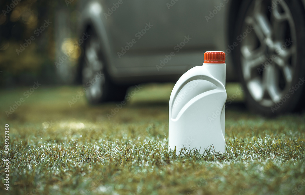 A bottle of engine oil with a clean label on the green grass. Advertising of liquid for the car. Car oil.