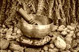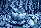 handmade Tibetan singing bowl with a mallet and cushion in outdoor setting, sound therapy for healing, relaxation and meditation