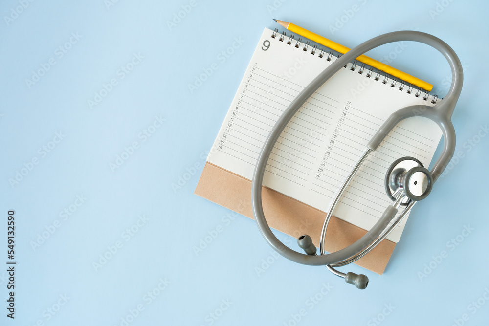 Top view of stethoscope, pencil and calendar on the blue background, schedule to check up healthy concept
