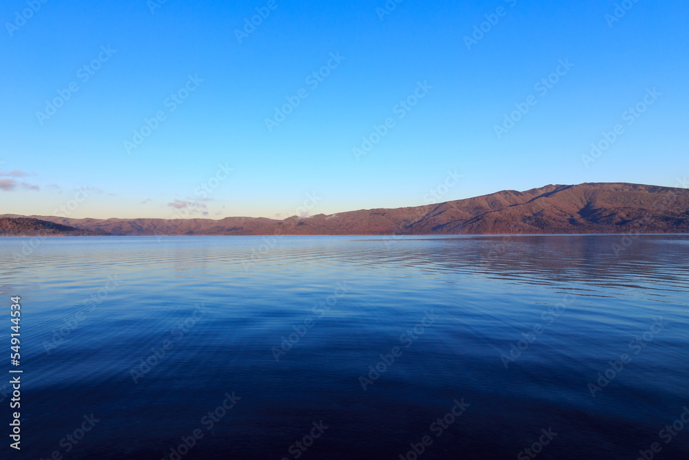 青空の下で遠くの山が朝陽にオレンジ色に染まる湖の風景。