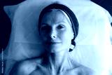 Mature woman laying at the couch and smiling while making beauty procedures top view