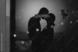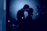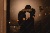 Reflection in the window couple in love kissing with lights in the background, romantic night in the hotel