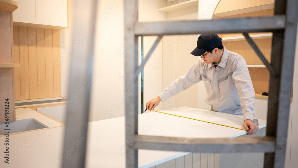 Home renovation or House remodeling concept. Asian male furniture assembler or Interior construction worker man using tape measure on countertop of the new kitchen.