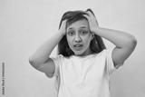 Scared teenage girl hold head and look at camera