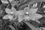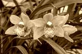 Closeup view of colorful yellow and brown flowers of cymbidium terrestrial orchid hybrid blooming outdoors in garden