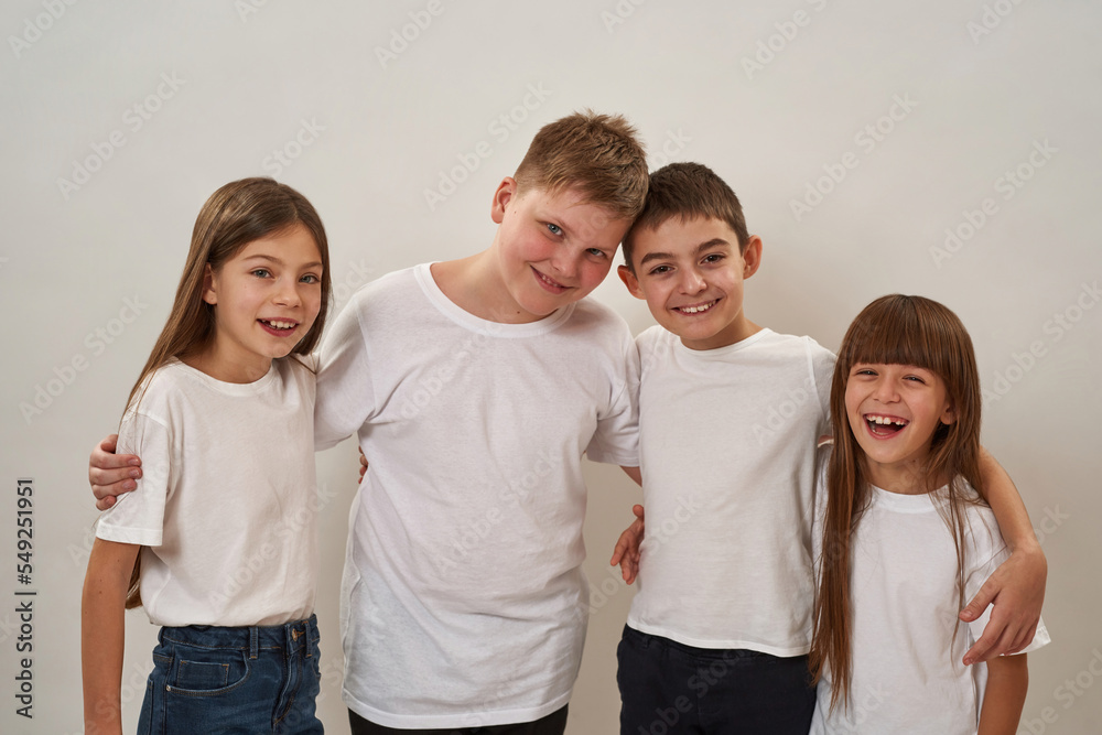 Four positive caucasian boys and girls hugging