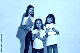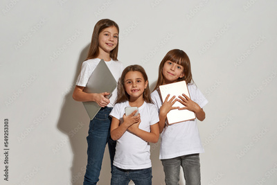 Three caucasian girls with gadgets on white