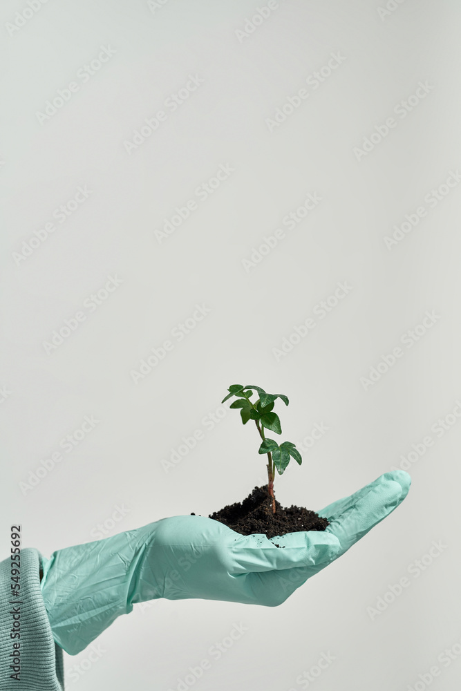 Partial girl wear gloves hold plant in ground