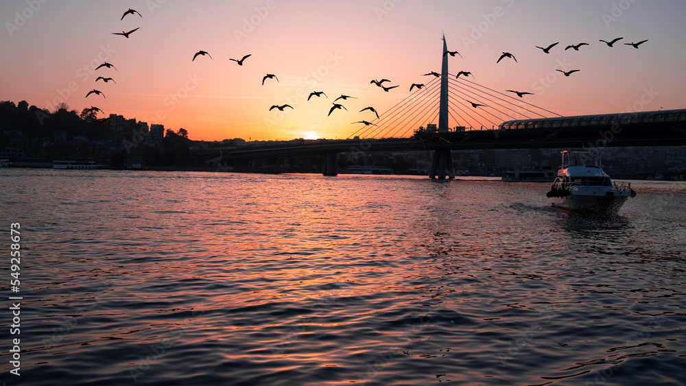 Beautiful sunset, Golden hours, Golden Horn metro bridge and the view of the Golden Horn in Istanbul, the sunset, the birds heading towards the sun, The image with space and text area.
