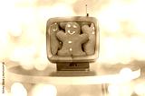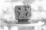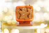 Tv showing movie of Woman in pullover holding straw basket with gingerbread man on the christmas tree background with beautiful light bokeh