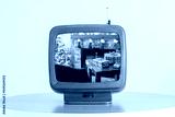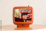 Tv showing movie of Armchair with plaid, packing gift boxes for family and glass of wine near christmas tree and fireplace. Top view .