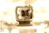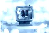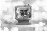 Tv showing movie of Woman in kitchen apron holding Christmas paper cup of hot chocolate in the hand