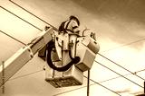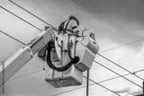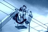 Electrician workman in green safety vest and helmet in crane lift working on highlines or traffic lights high in the air with sky background