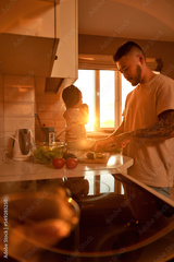 Man cut cucumber on chopping board near daughter